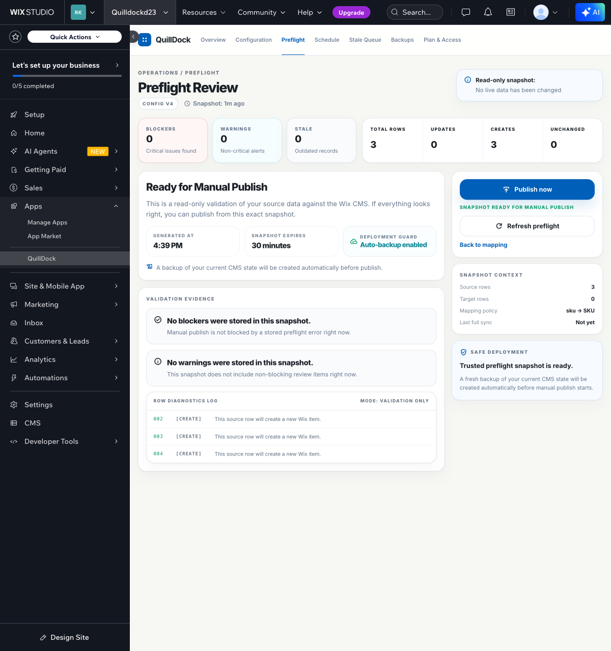 Trusted preflight compares your current source state against your current Wix CMS collection so you can review what will be created, updated, unchanged, or flagged for stale review before anything writes.